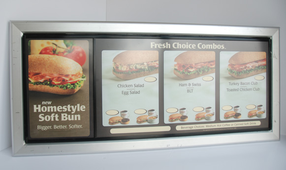 Menu panels for major coffee house, edge lit curved acrylic panel to hold graphic, carved acrylic panels with edge light for reception halls.